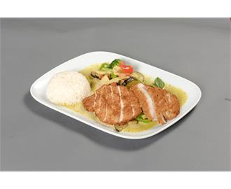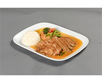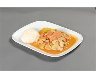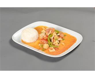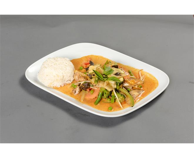 €10.50Rotes Thai-Curry, Paprika, Karotten, Erbsen, Tomaten und tropische Früchte in Kokosmilch
