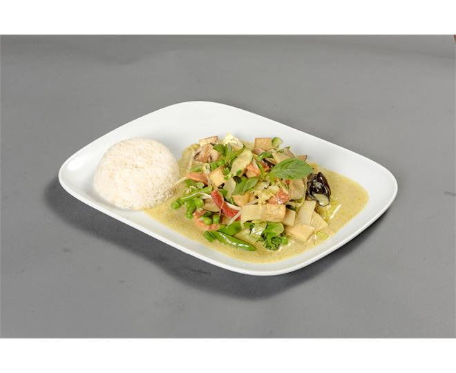 €12.00Verschiedenes Gemüse mit grünem Thai-Curry, Thai-Basilikum, Sojasprossen, Tofu, in Kokosmilch