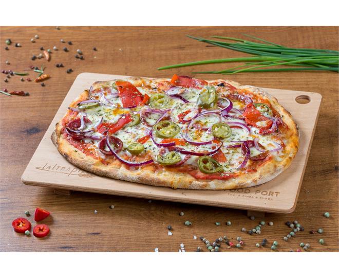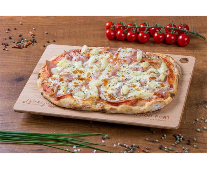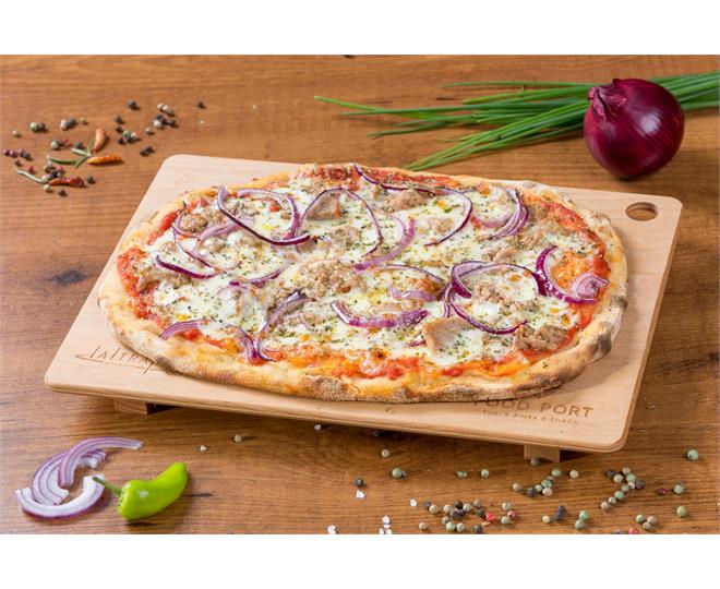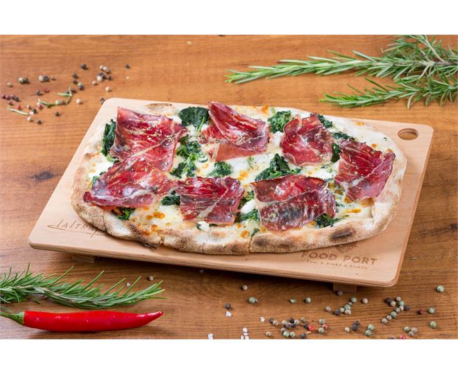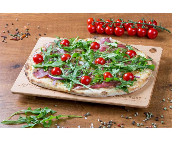 €12.90ohne Tomatensoße mit Speck, Rucola, Cherry Tomaten und roten Zwiebeln