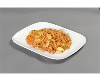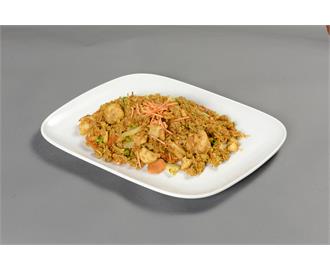 €9.90Gebratener Reis mit Hähnchenfleisch und Garnelen, gelber Currypaste, Ei und Gemüse