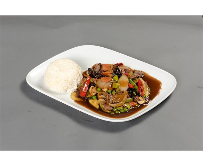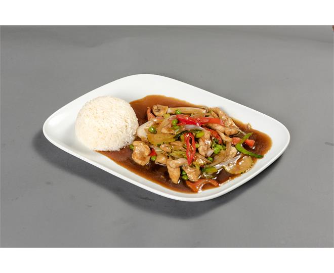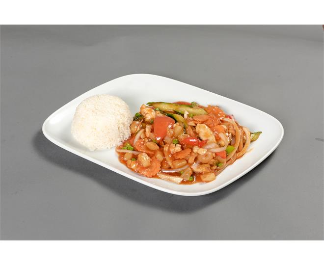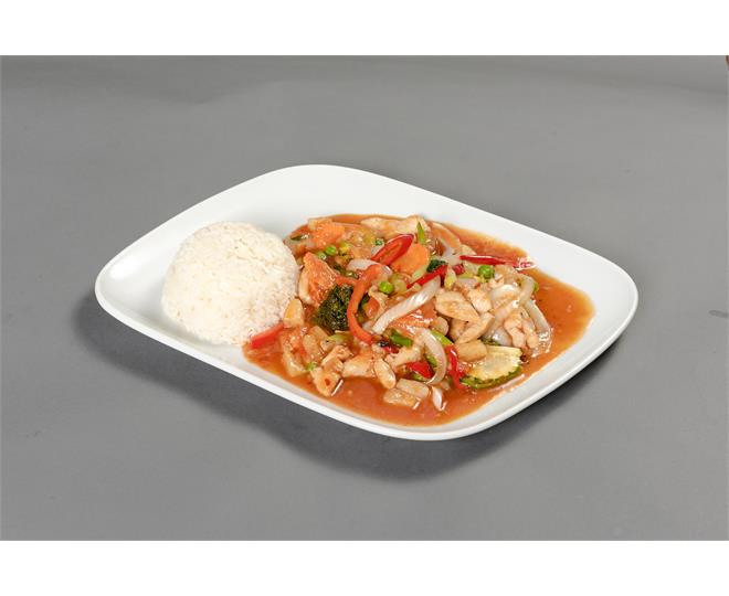 €10.50Ananas, Erbsen, Paprika, Karotten, Lauch, Brokkoli, Peperoni, Zucchini und Zwiebeln, in süßlich-pikanter Soße