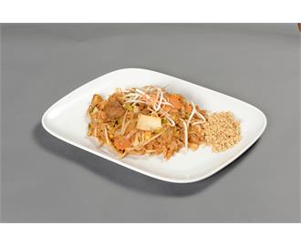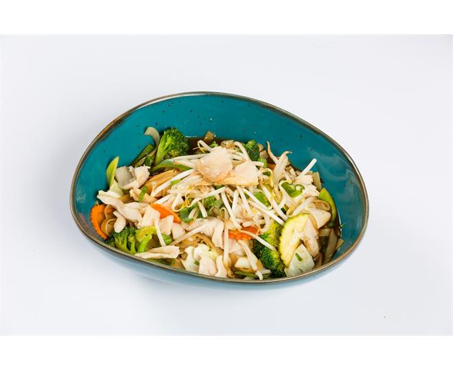 €13.90Gebratene gelbe Nudeln mit Ei, Gemüse, Sojabohnen, Champignons, Peperoni und Thai-Basilikum
