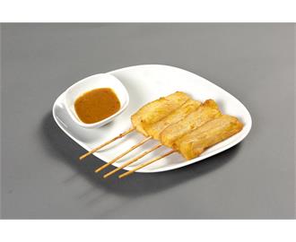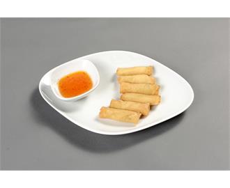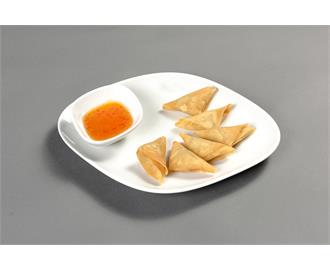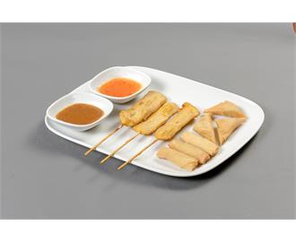 Gemischter Vorspeisenteller mit 3 Frühlingsrollen, 3 Wan Tan, 3 Hähnchenfleischspießen, dazu Erdnuss- und süß-saure Soße