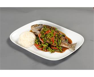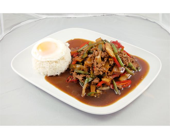 €13.50Gehacktes Rindfleisch mit Bohnen, Paprika, Peperoni, Zwiebeln, Bambussprossen, Thai-Basilikum, Spiegelei und Reis