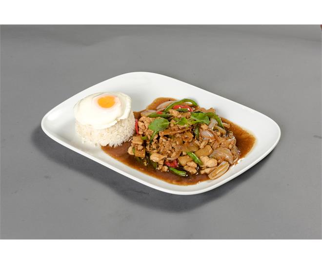€14.50Gehacktes Hähnchenfleisch mit Bohnen, Paprika, Pepero ni, Zwiebeln, Bambusspros sen, Thai-Basilikum, Spiegelei und Reis