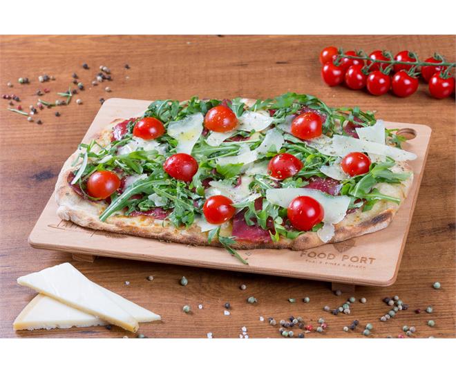 ohne Tomatensoße mit aromatischen Cherry Tomaten, Bresaola an frischem Rucola und mit Parmesansplittern abgerundet