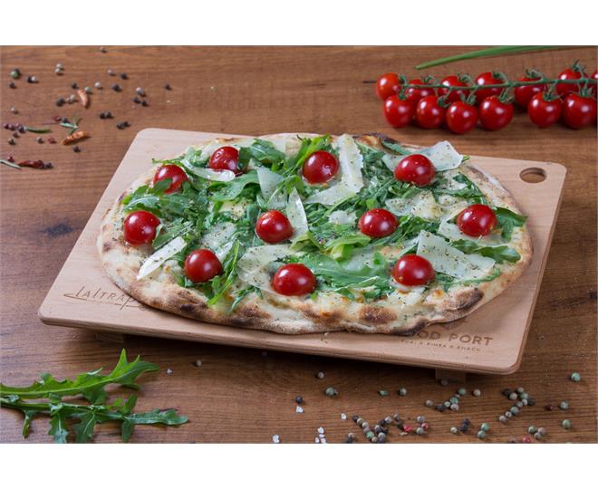 €13.50ohne Tomatensoße mit aromatischen Cherry Tomaten, Rucola und Parmesan